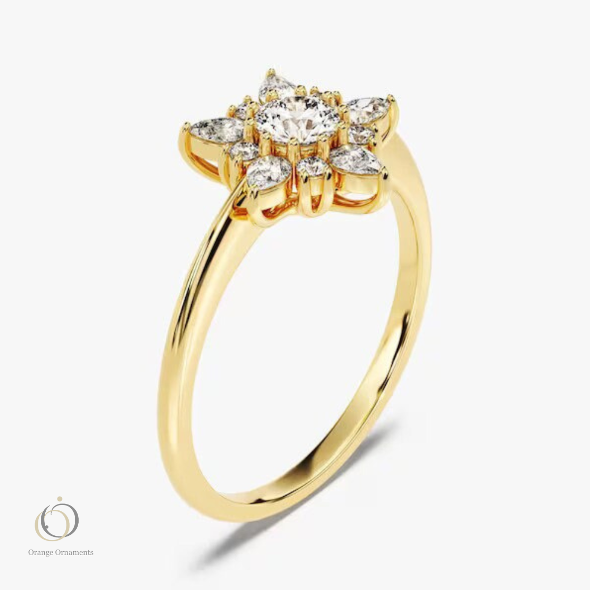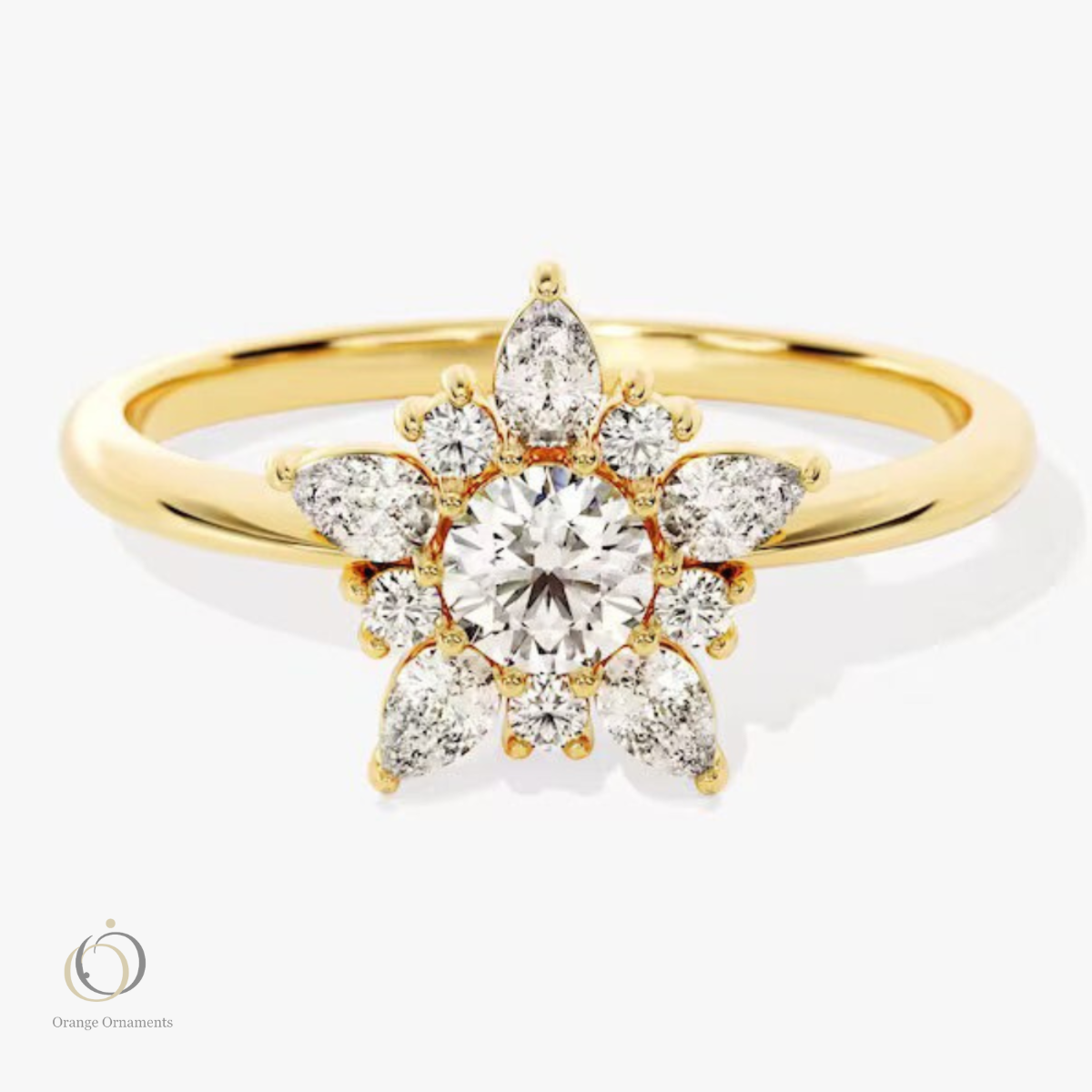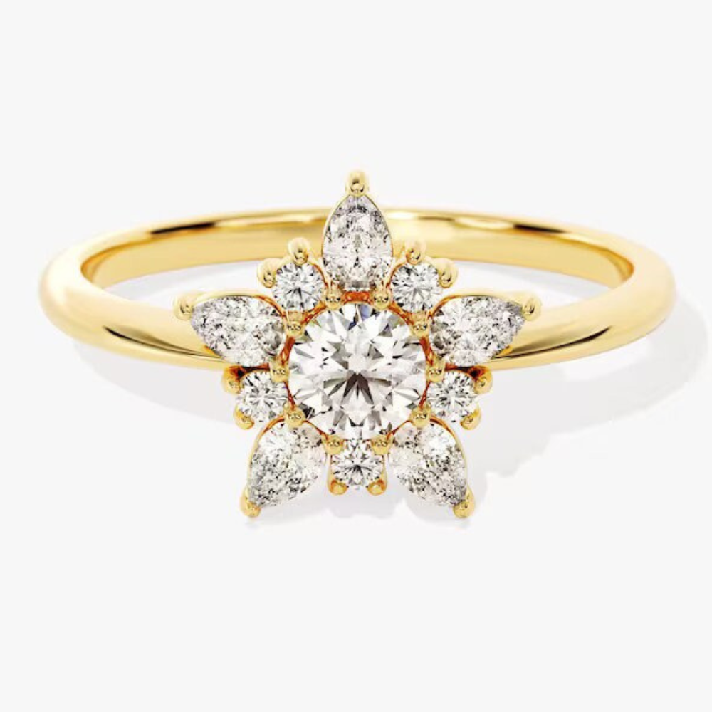 "Elegance meets nature with this stunning 14K solid gold engagement ring featuring a 0.5 CT round Moissanite center stone surrounded by a pear cluster. A vintage, stackable masterpiece."
