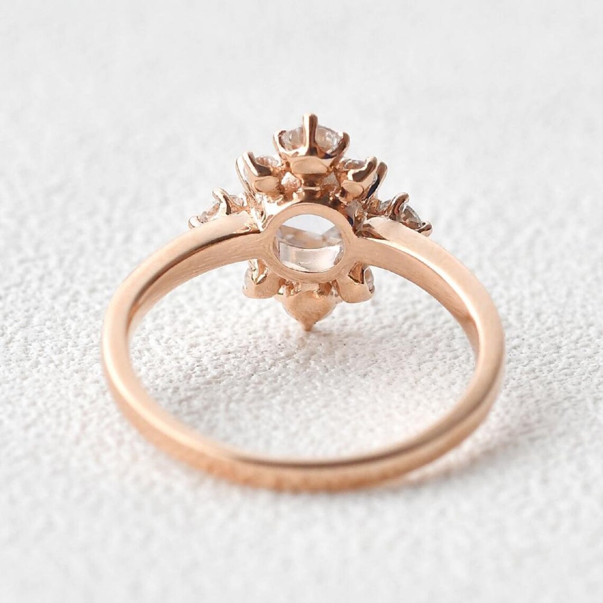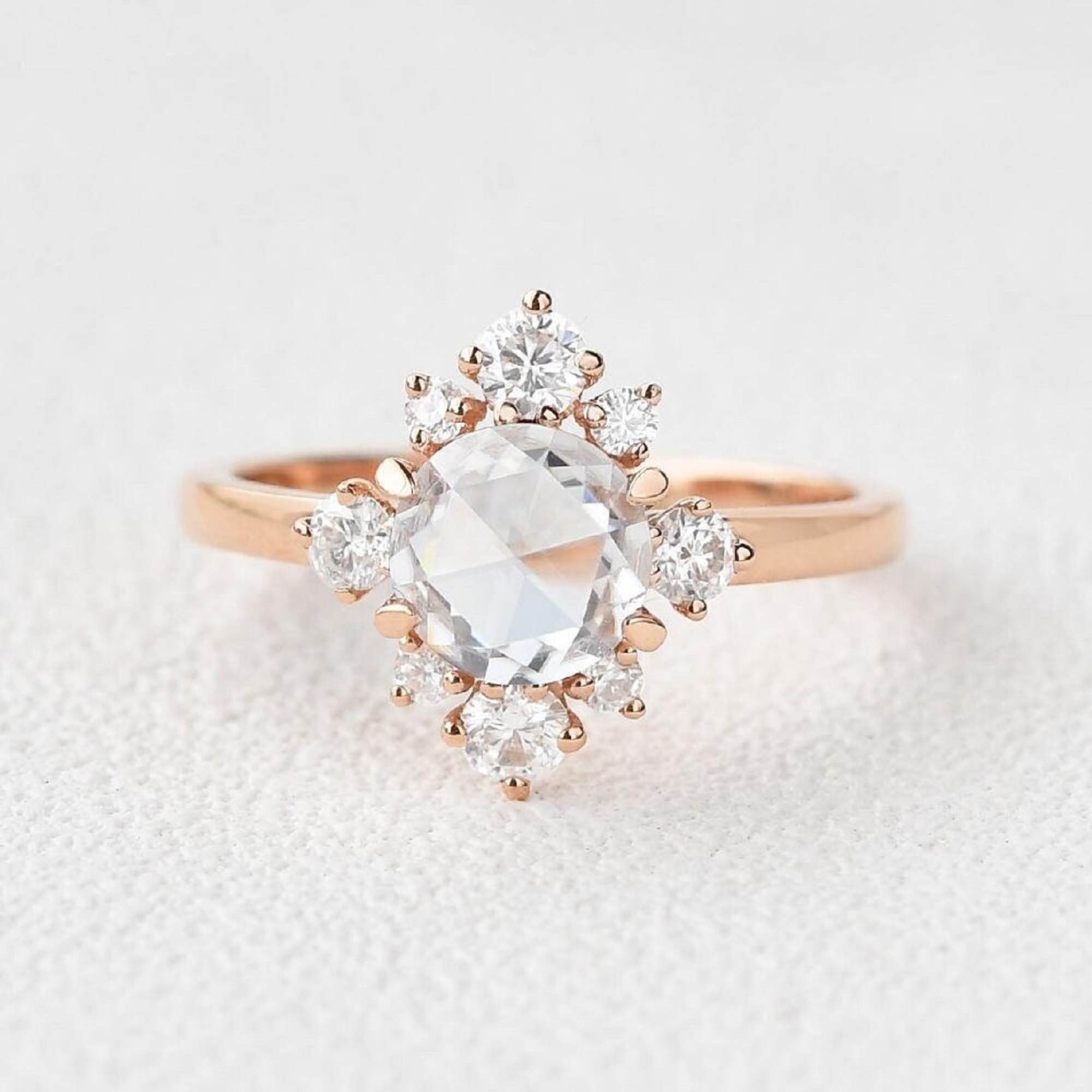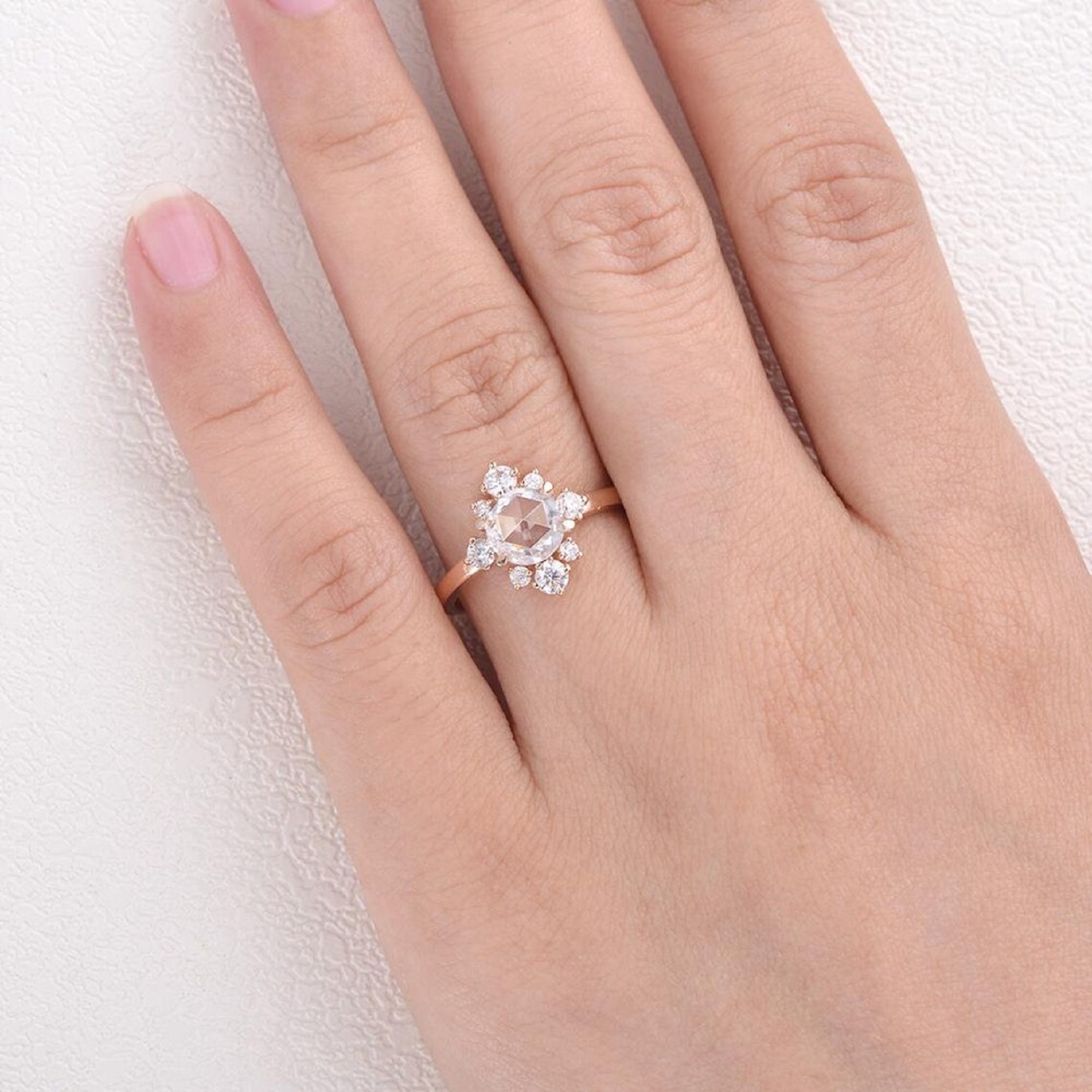 "Embrace vintage allure with this 2.50 Ct Antique Round Rose Cut Moissanite Engagement Ring. Its unique charm lies in the cluster of moissanite diamonds set in a round rose-cut style. A captivating gift for her, it evokes timeless romance and beauty in a modern world."
