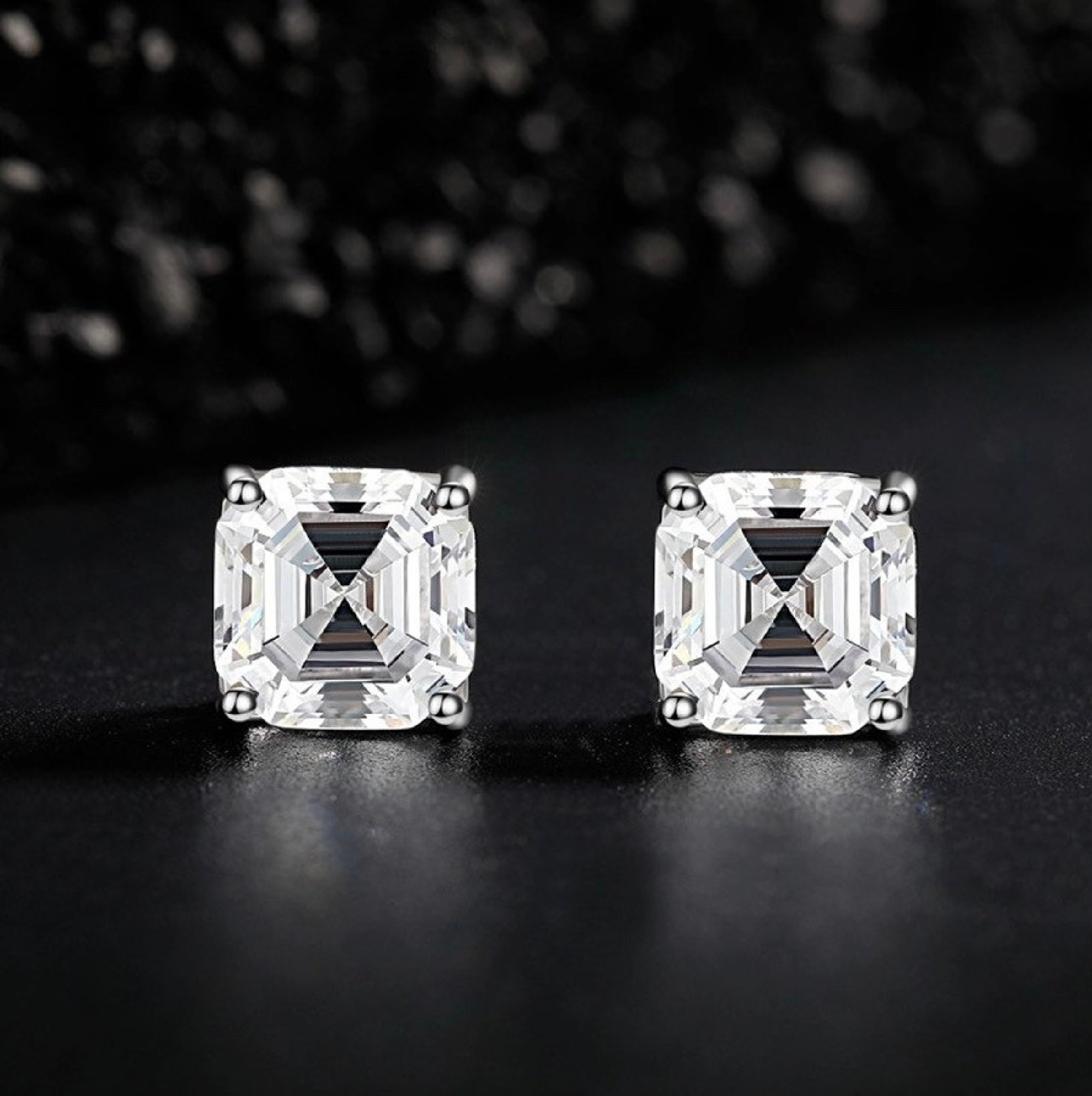 "Dazzle with 4.5 MM Asscher Moissanite Earrings – A Brilliant Gift for Birthdays and Valentine's Day. Discover the elegance of colorless moissanite in these Asscher Solitaire push-back earrings, a timeless addition to any jewelry collection."
