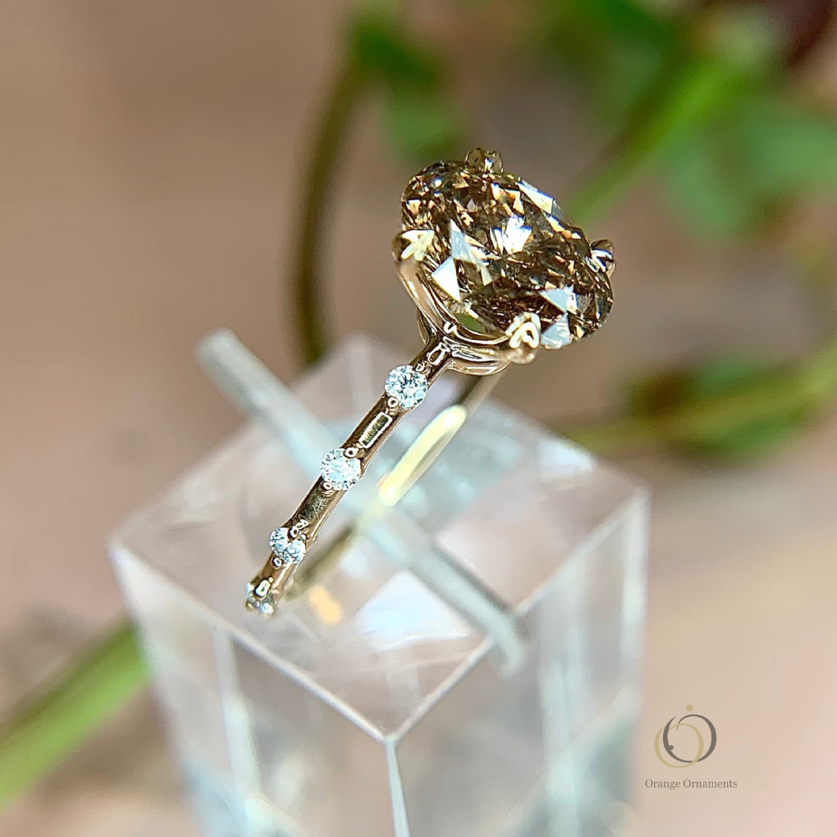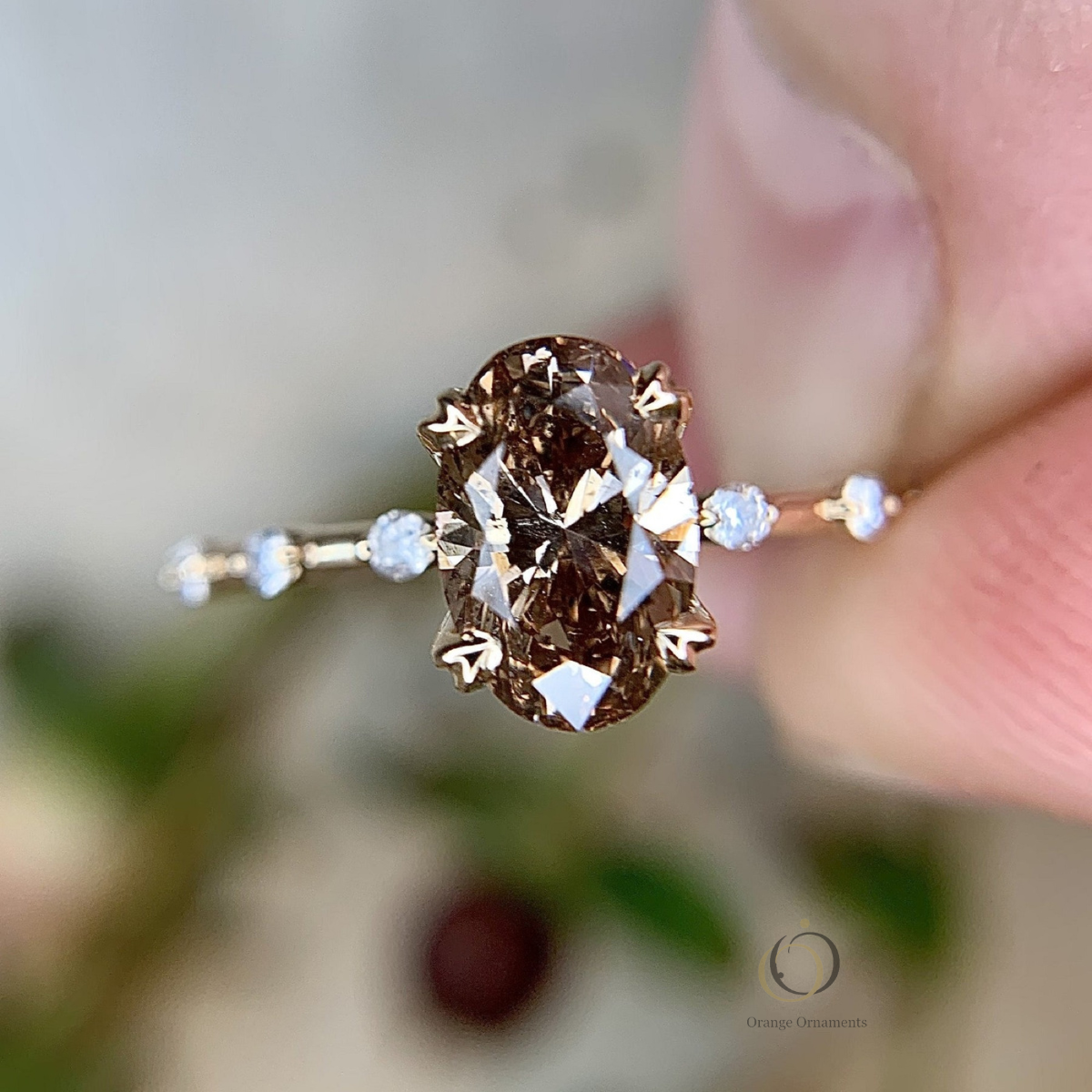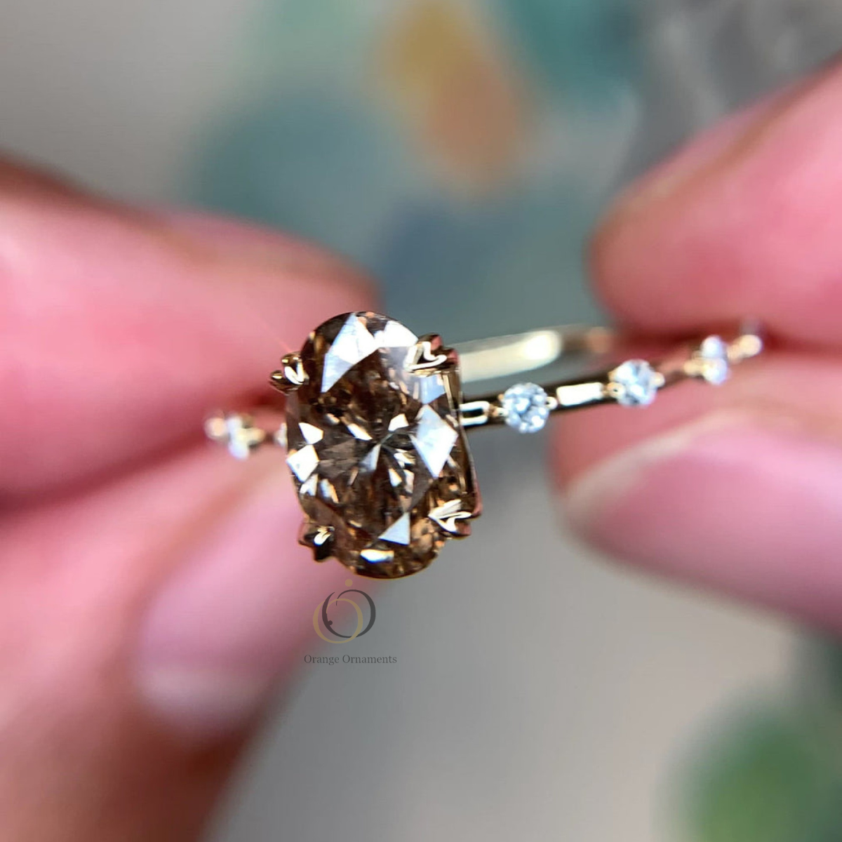 "1.55 Ct Oval Cut Brown Moissanite Engagement Ring: Champagne Elegance with Bubble Band"