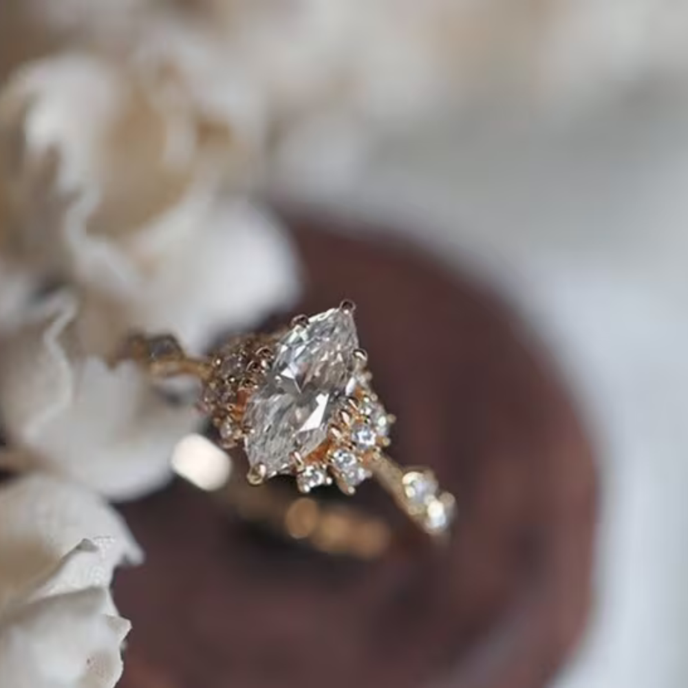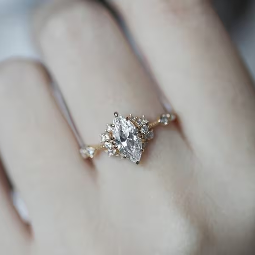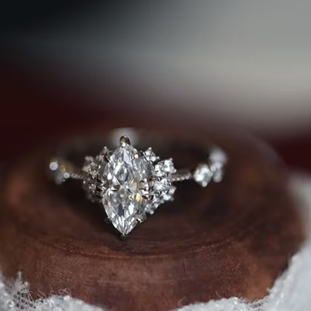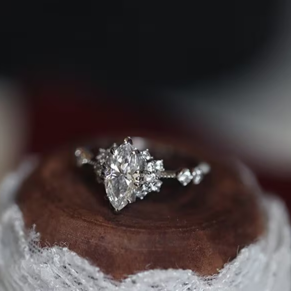"Elevate your love story with our Unique Marquise Diamond Simulant Ring. Crafted in Sterling Silver 925, it's a stunning statement piece, perfect for engagements or promises."