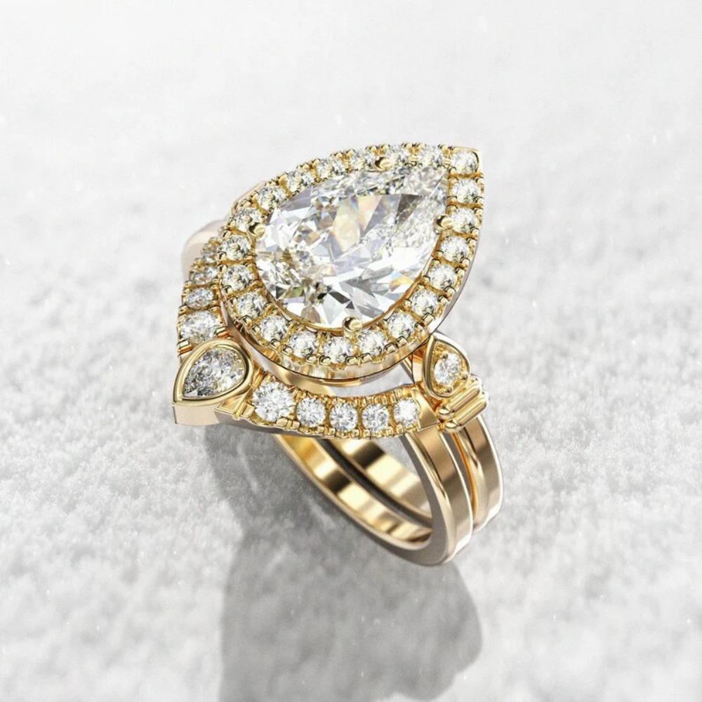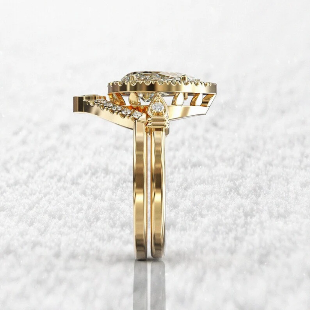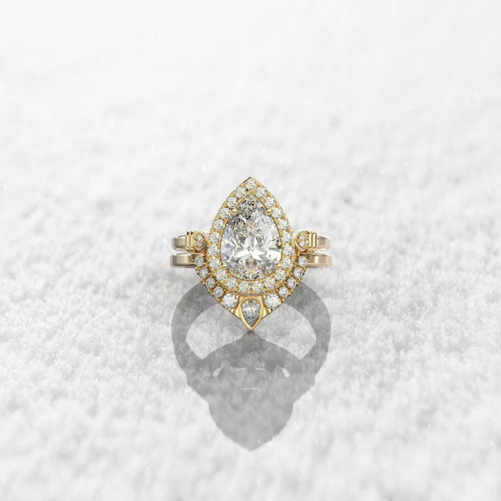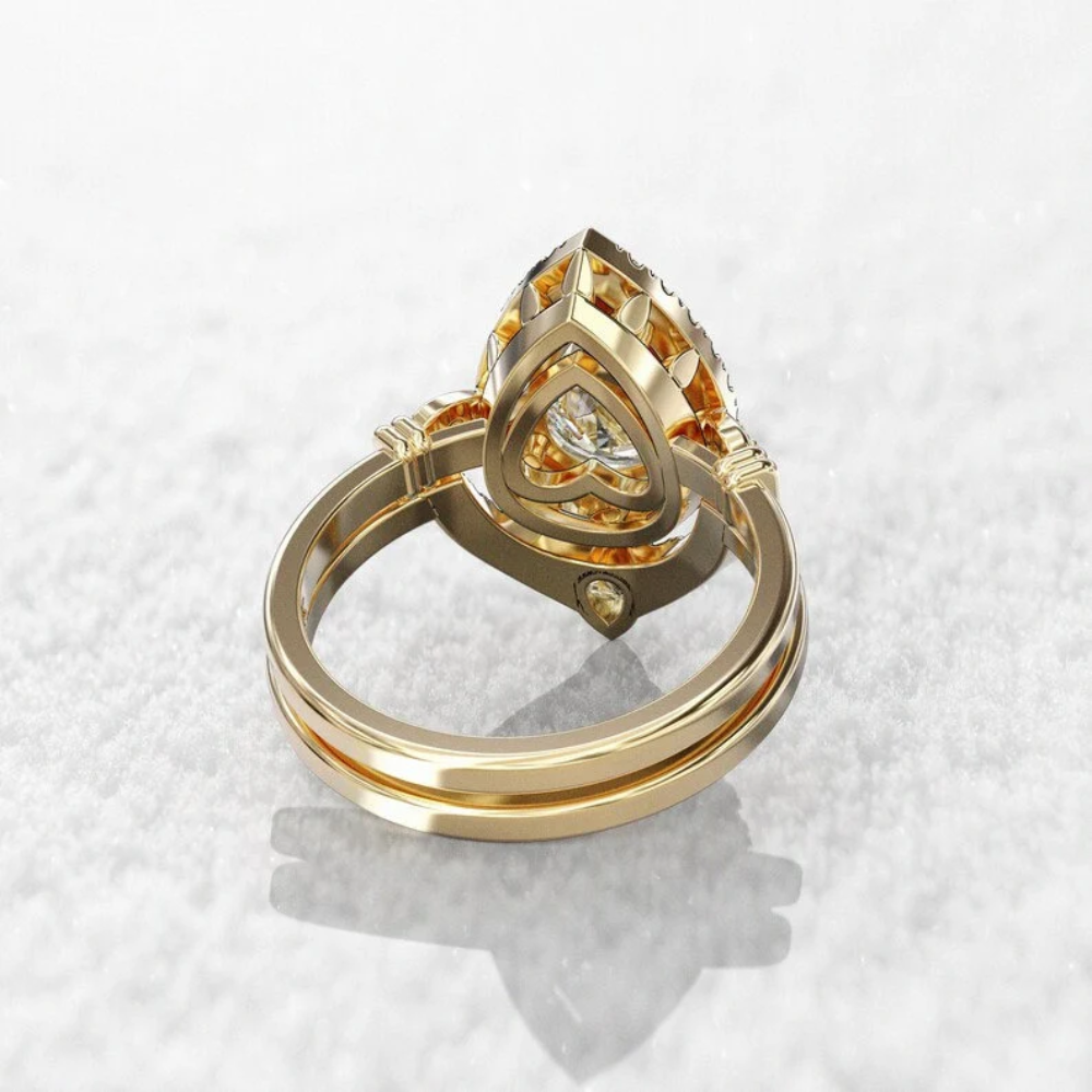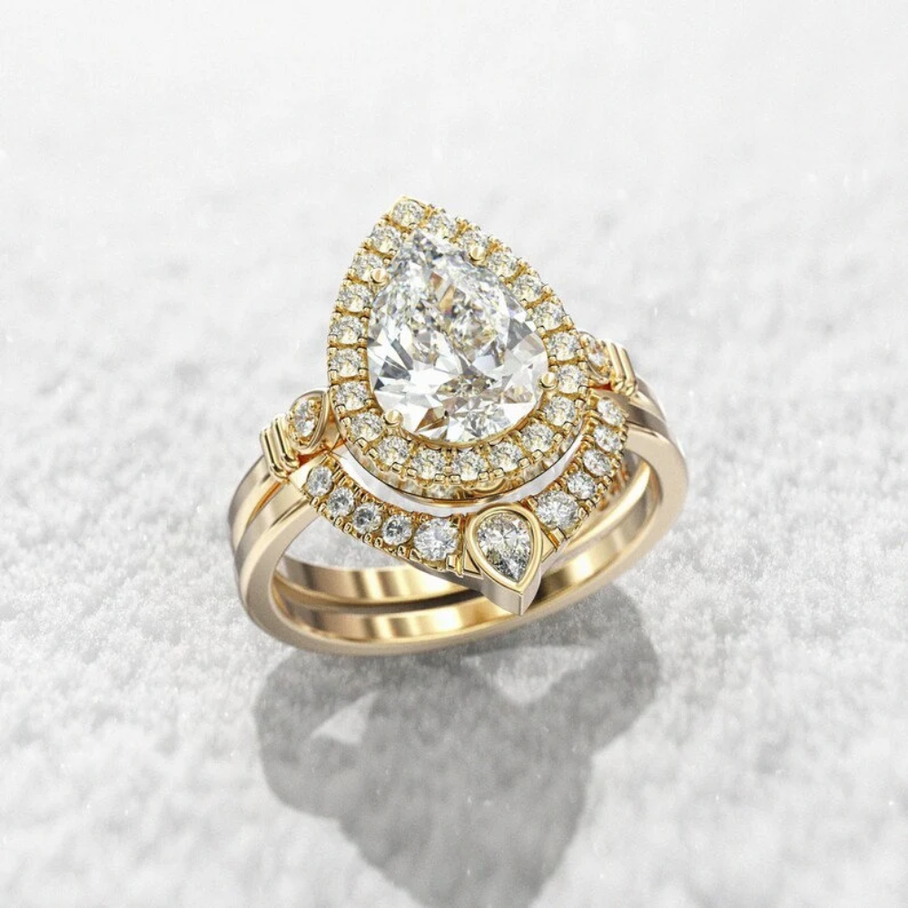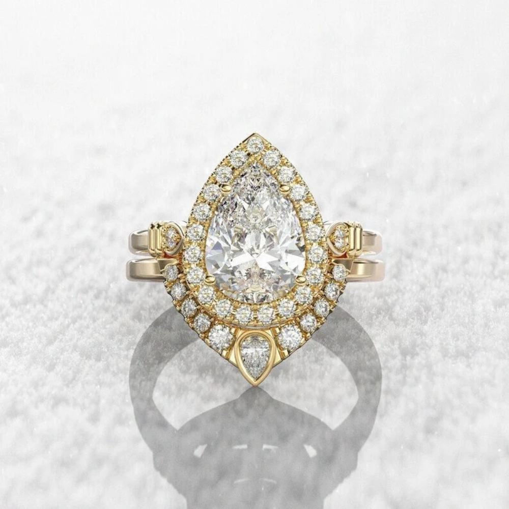 "Captivate with our Pear Cut Moissanite Engagement Ring featuring a radiant Halo, flanked by two exquisite Diamond Side stones. This set includes a matching Moissanite Wedding Band for a perfect union of elegance and sophistication."