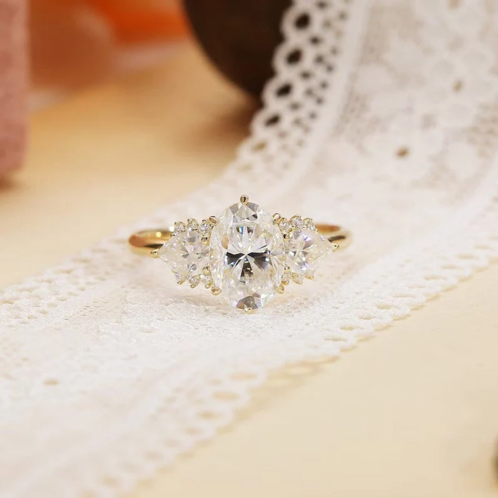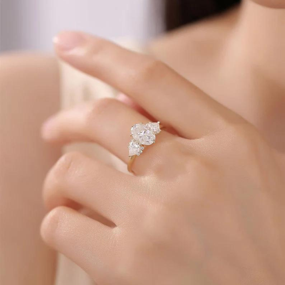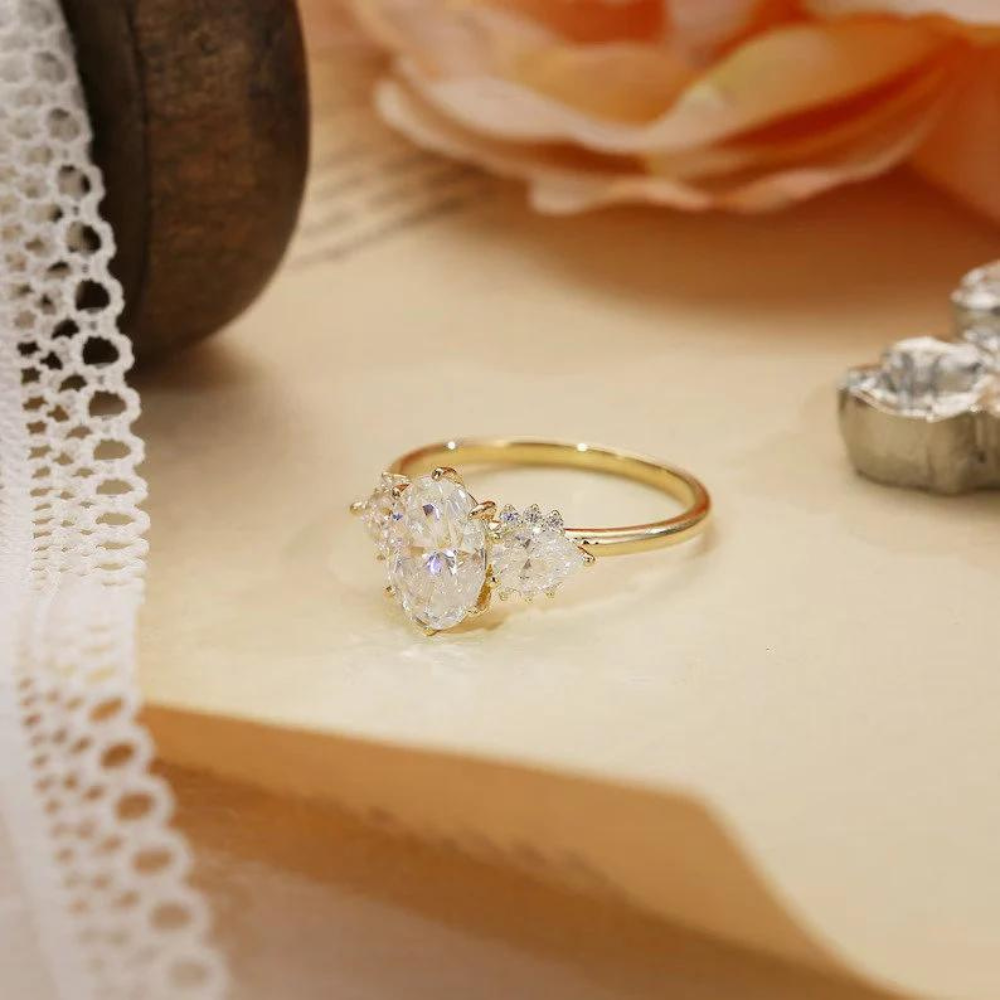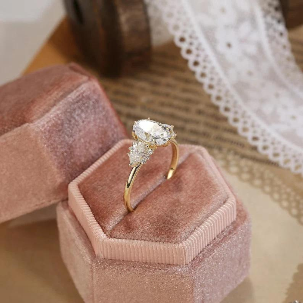 "Captivate her heart with this exquisite three-stone engagement ring, featuring an oval-cut Moissanite centerpiece in 9K/14K/18K solid gold. A timeless symbol of love and commitment."