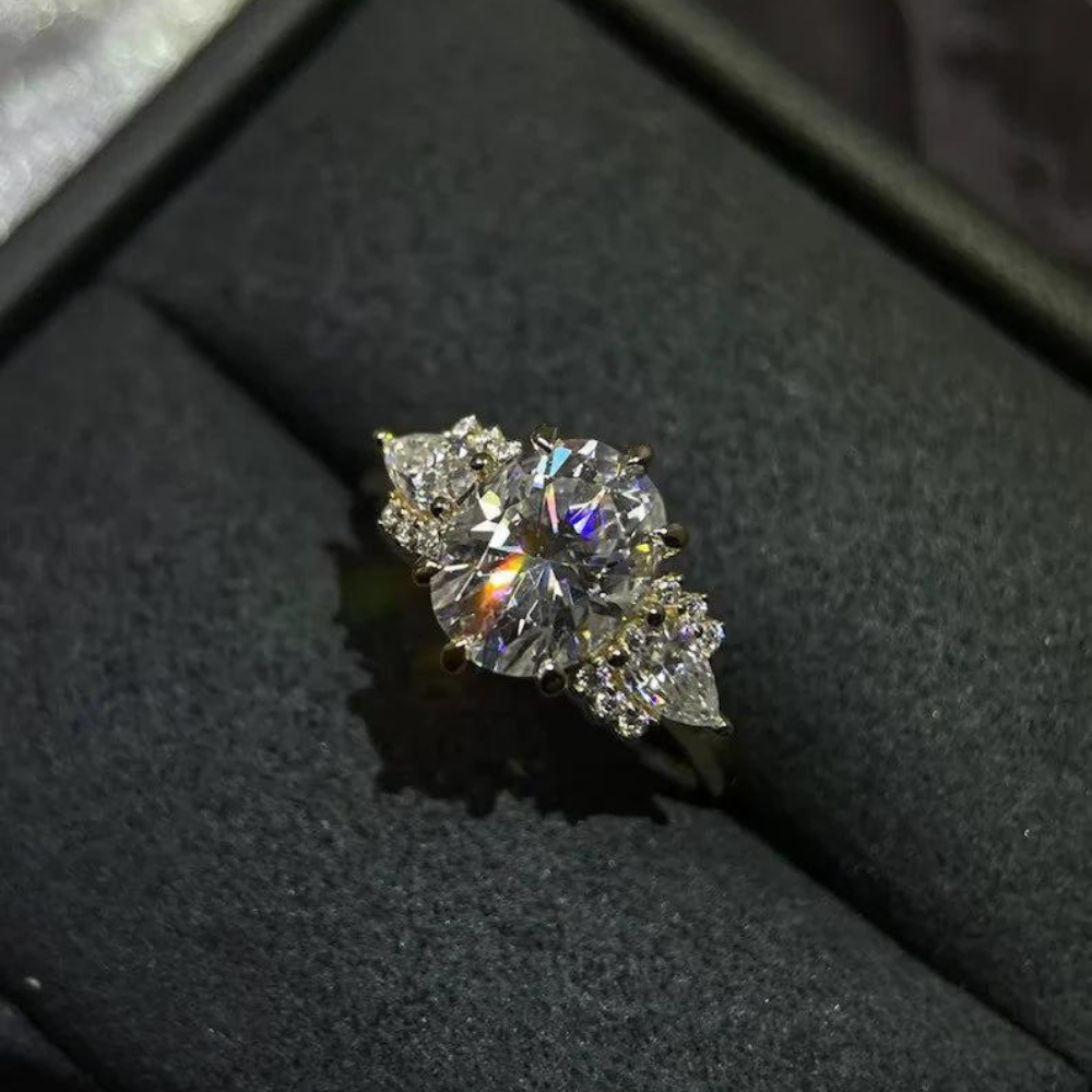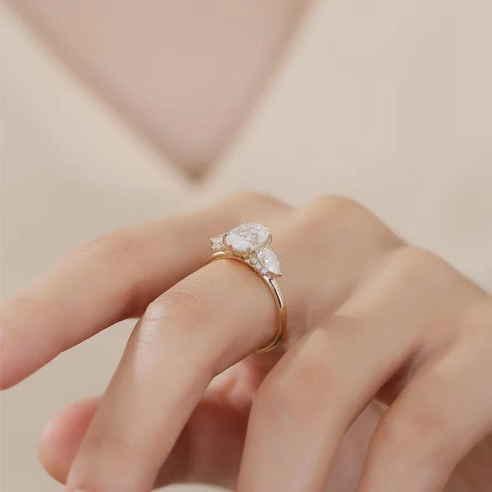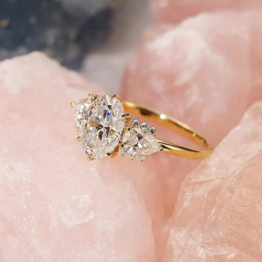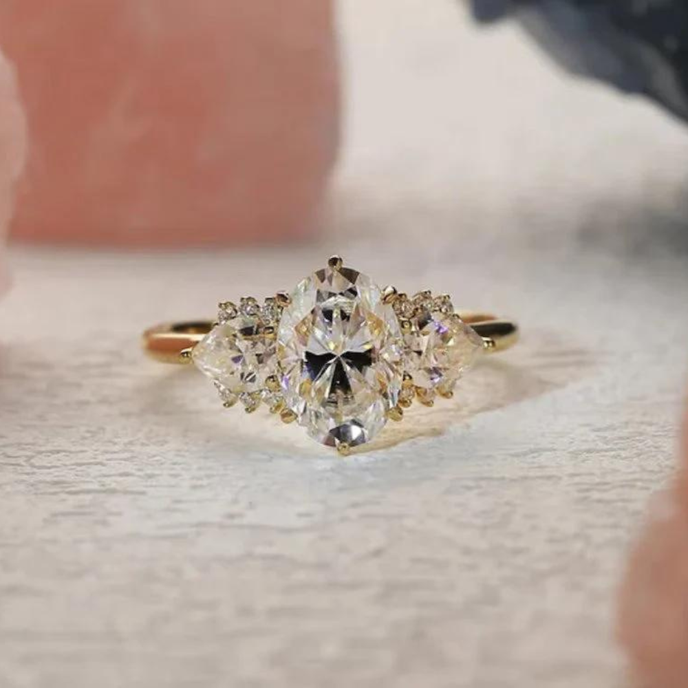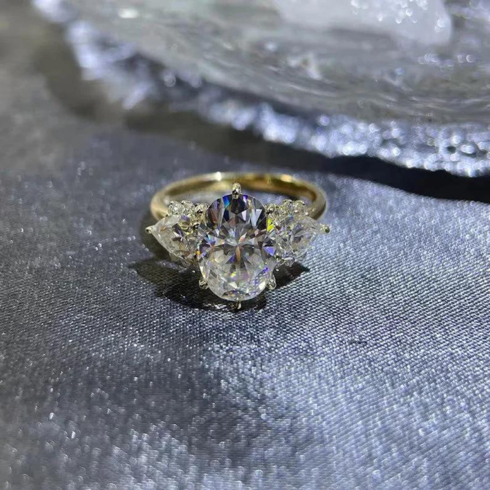 "Captivate her heart with this exquisite three-stone engagement ring, featuring an oval-cut Moissanite centerpiece in 9K/14K/18K solid gold. A timeless symbol of love and commitment."