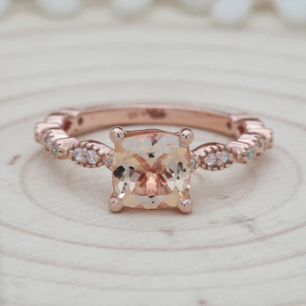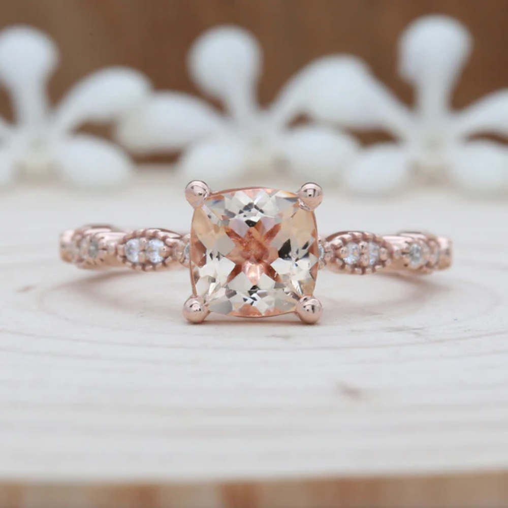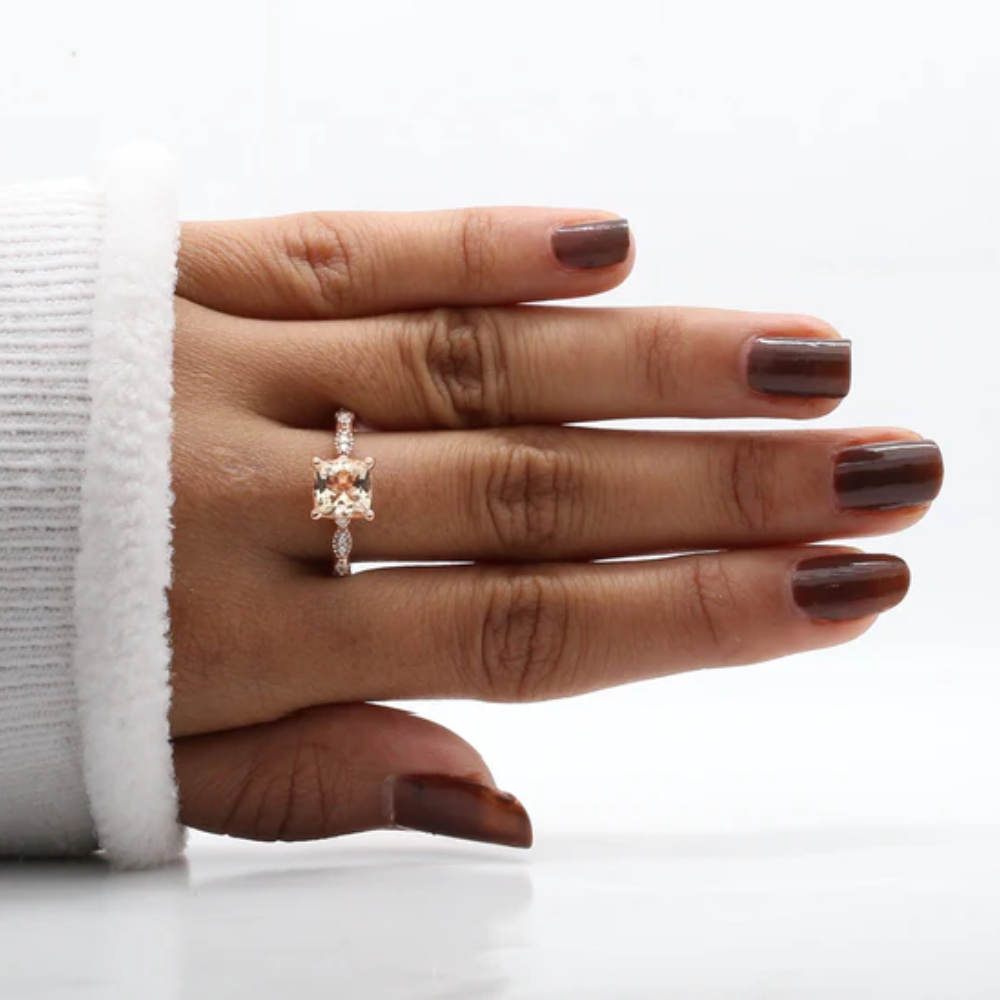 "Elegance in Every Hue! Choose your solitaire Cushion Peach Morganite Engagement Ring in Rose Gold, White Gold, or Yellow Gold. Perfect for your special day."