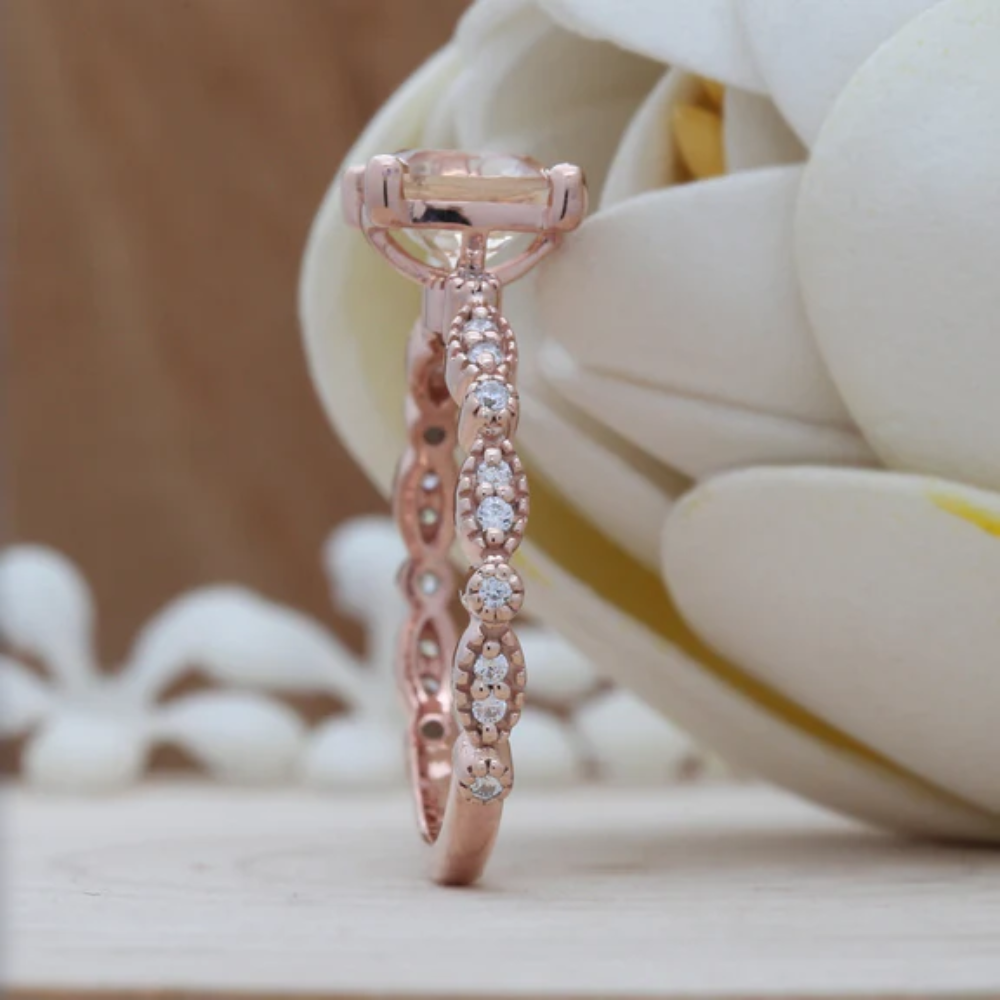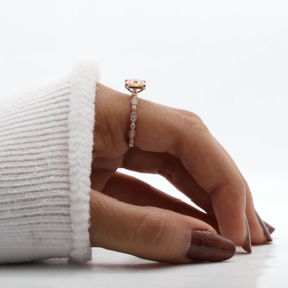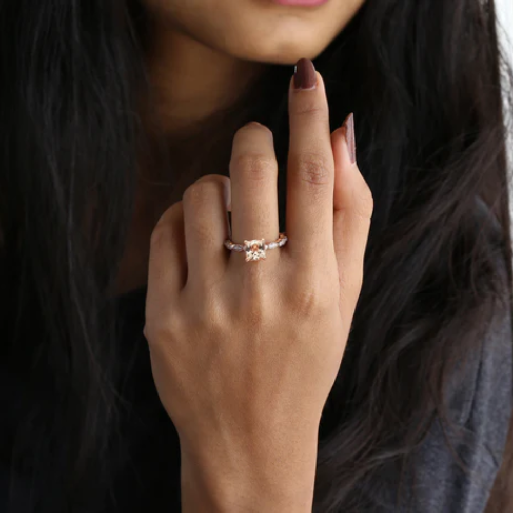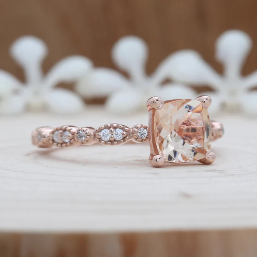 "Elegance in Every Hue! Choose your solitaire Cushion Peach Morganite Engagement Ring in Rose Gold, White Gold, or Yellow Gold. Perfect for your special day."